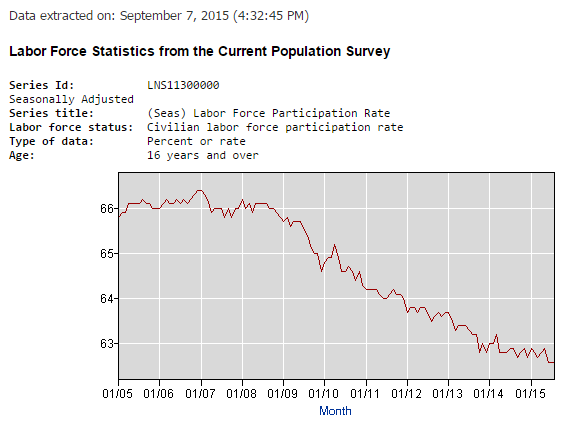 The country’s labor force participation rate – which measures the share of Americans at least 16 years old who are either employed or actively looking for work is at a 38-year low, 62.6 percent as of Jul 16, 2015 Chart shows labor participation rate 2005 – 2015. See http://data.bls.gov/timeseries/LNS11300000